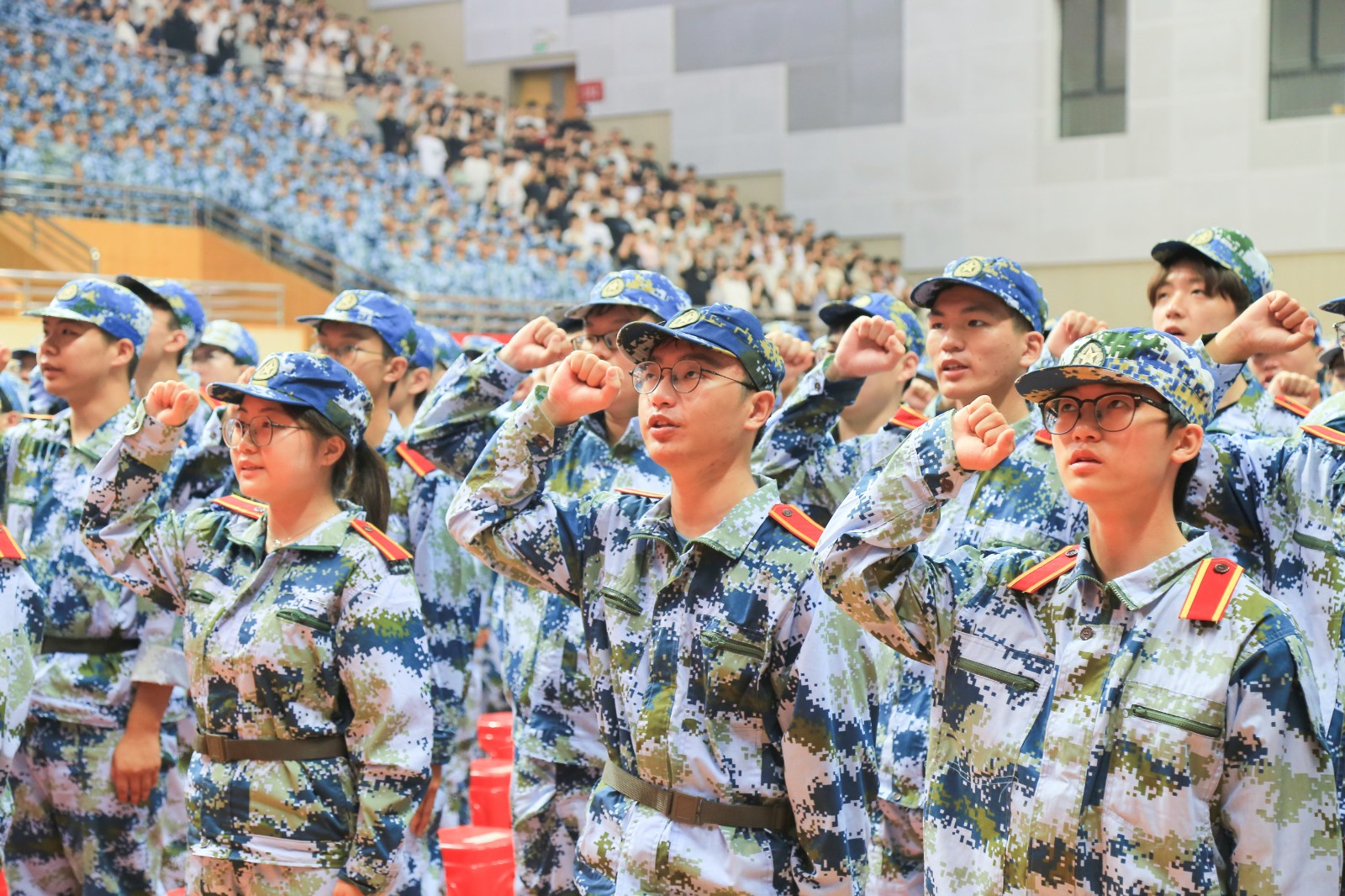 在全场热切瞩目中,杨建新、潘锦全、李恒川为2025级新生代表颁授校徽,王志东为军训独立团授旗。